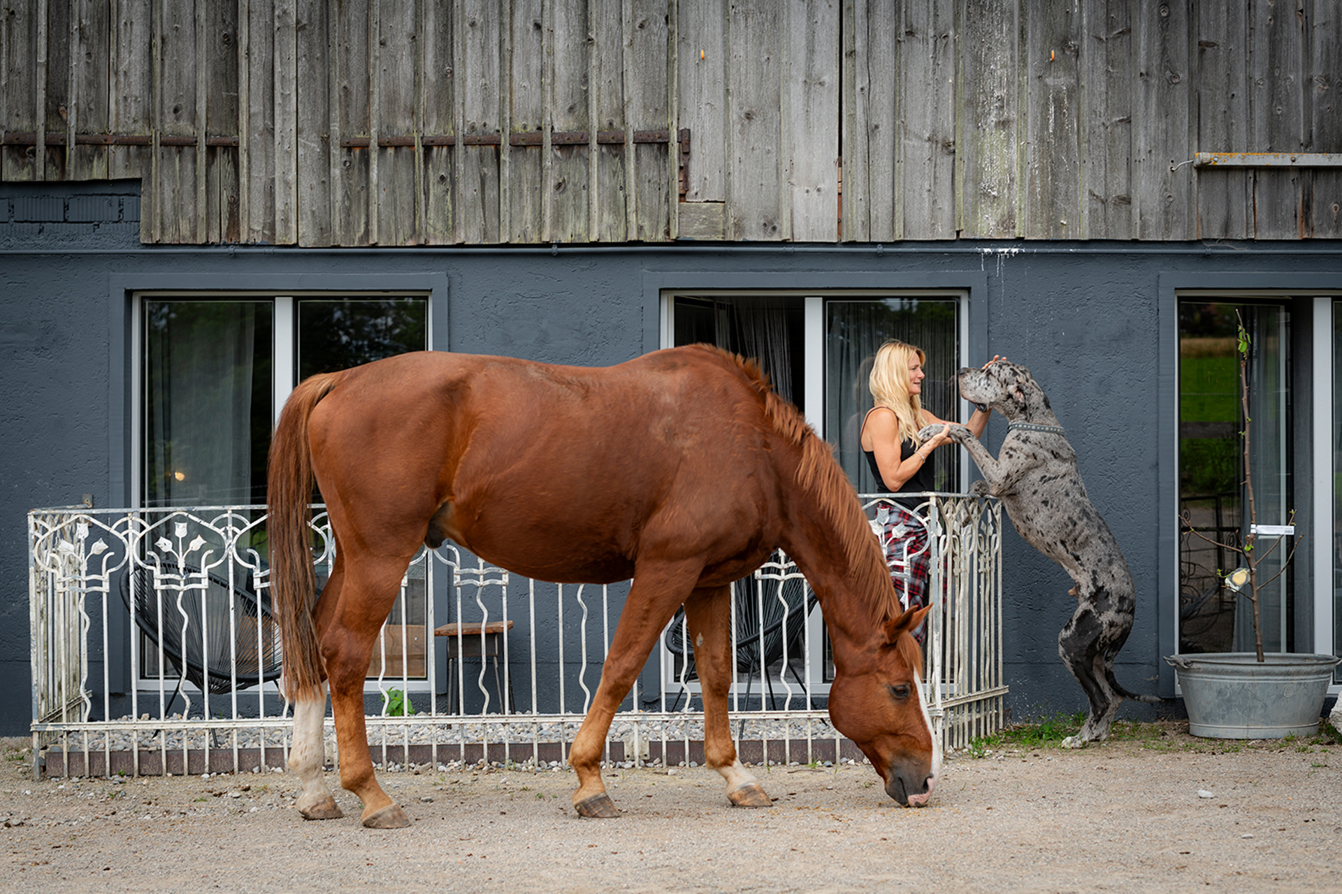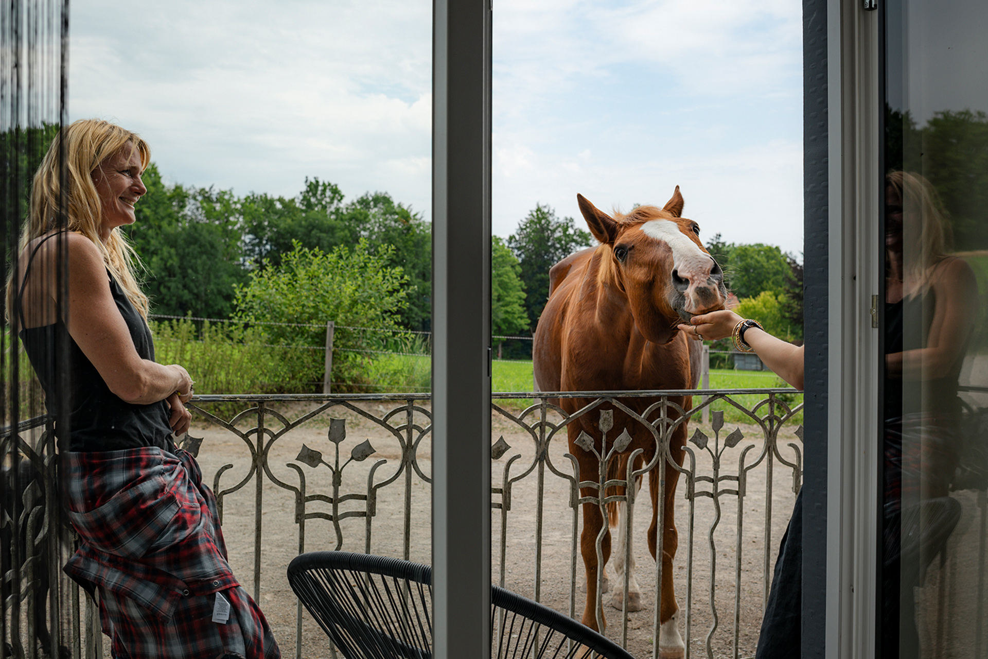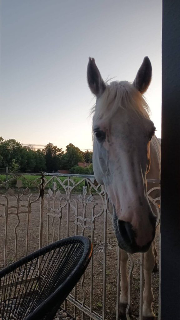 der kleine balkon geht auf unser pferdepaddock hinaus. kuscheln und pferdenasen streicheln erlaubt, füttern absolut verboten ( wir haben zwei kranke tiere, für die schlicht lebensgefahr besteht bei möhre, leckerli und co…. leider).