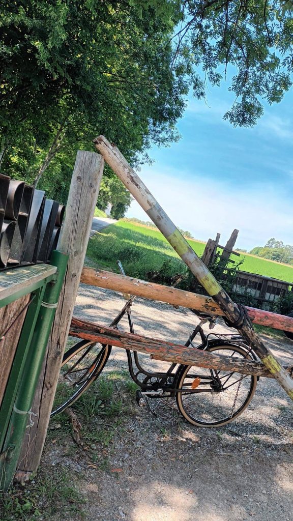im eingang , durch mein holzlager hindurch, steht für euch eine semmelkutsche bereit… ohne e, einfach strampeln, und das an der wand hängende sup dürft ihr jederzeit zum see tragen um dort herum zu suppen.